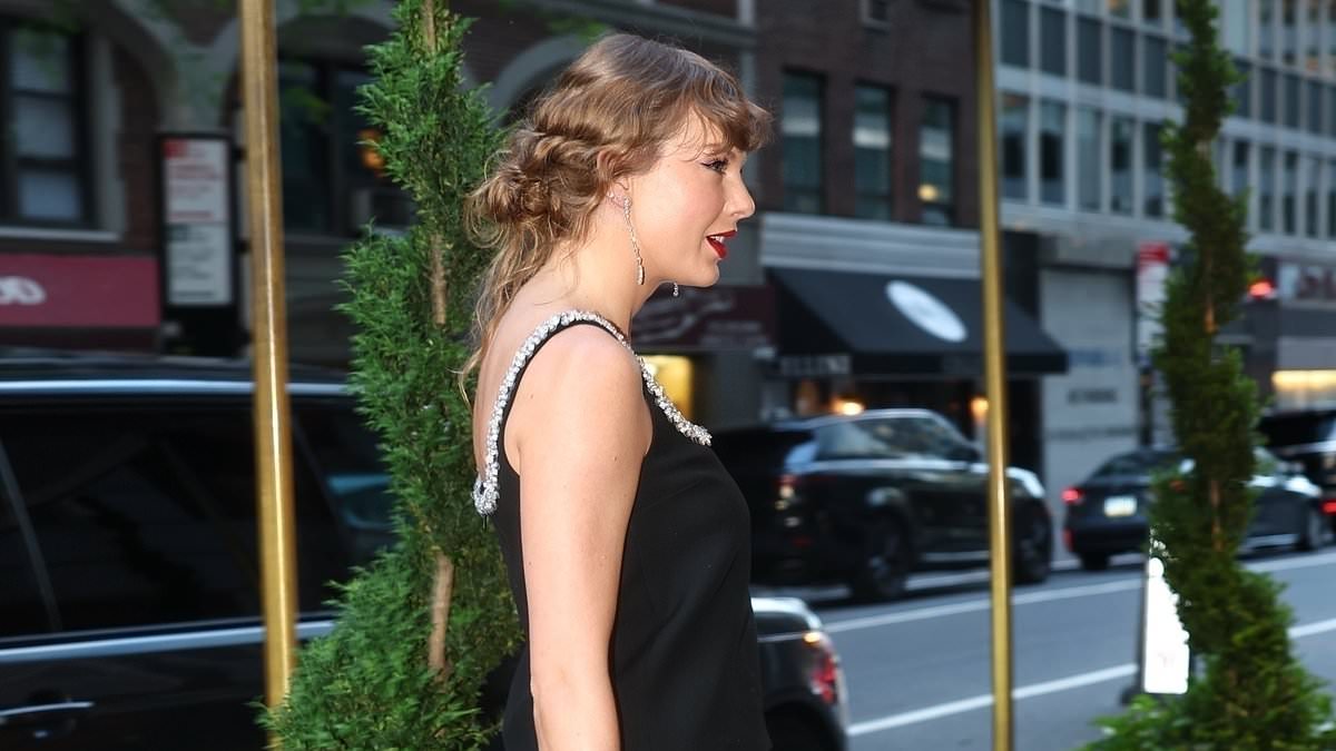 Swift was seen wearing a black minidress with silver platform heels, diamond strand earrings and carrying a black handbag.